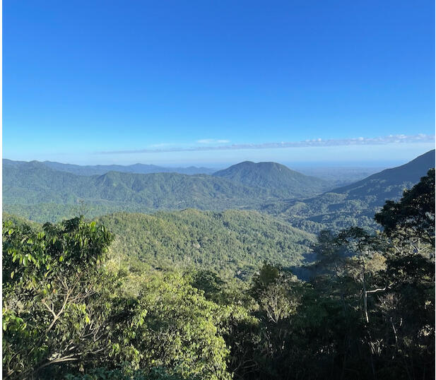 El cambio de altitud transforma el clima: temperaturas más frescas, neblina suave y un entorno boscoso que contrasta con el litoral.